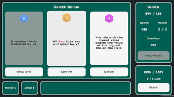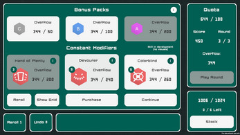 - If the score is greater than quota, all the exceeding score is converted to overflow – a currency you can use to buy modifiers, which increase your chances of surviving the next quota. You can choose one of three randomly suggested modifiers, or skip them to stash up some overflow for the next time.